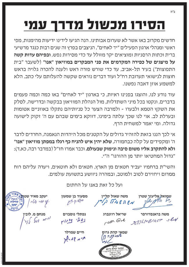 לנוכח סירובה העיקש של הנהלת מוזיאון "אנו" (לשעבר בית התפוצות) בתל אביב, להיענות לפניות יד לאחים ולהסיר את המיצגים הפוגעניים המכירים בנישואי תערובת רח"ל ובחילול שם שמים, יצאו בימים אלו גדולי הפוסקים, הדיינים והרבנים מכל החוגים והעדות בקריאת קודש כואבת בה נקרא הציבור כולו שלא להתקרב למוזיאון ולא להניח כף רגל במפתנו.