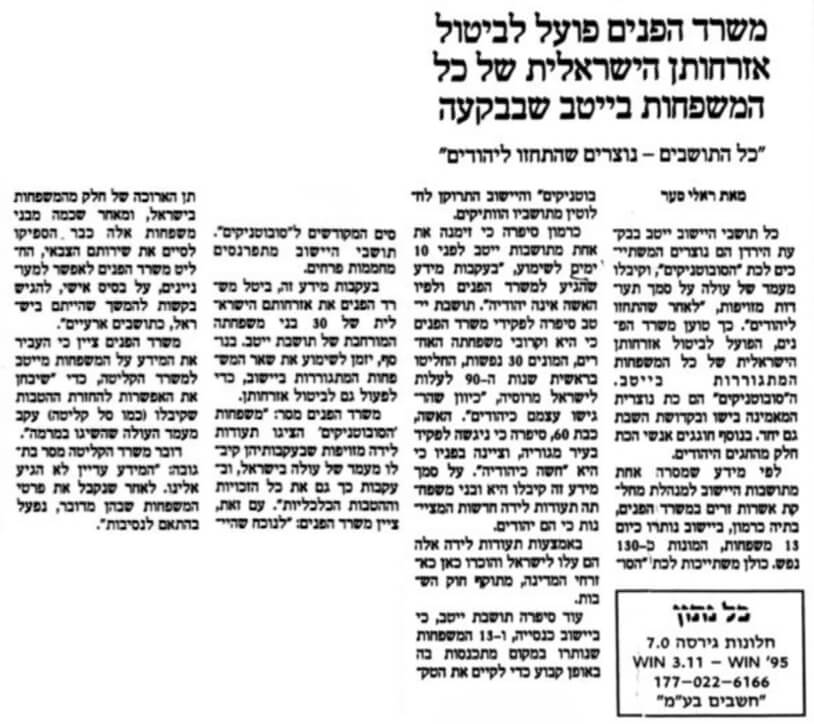 • עיתון "הארץ" (05.06.1997): בכתבה מאת ראלי סער דווח כי משרד הפנים פועל לביטול אזרחותן של כל המשפחות בייט"ב. בשימועים שנערכו, הודו חלק מהתושבים כי הם נוצרים המאמינים בישו, והמידע הועבר למנהלת מחלקת אשרות וזרים, בתיה כרמון.